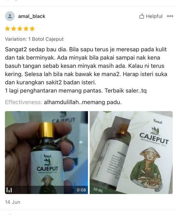 PUAS HATI! Rata-rata pengguna yang menggunakan Raed Cajeput Aromatherapy Oil ni memberi maklum balas yang sangat positif. Alhamdulillah kami masih belum lagi menerima maklum balas yang tidak berkesan.