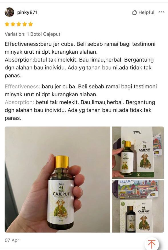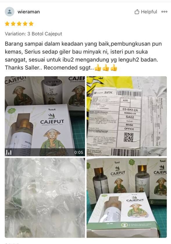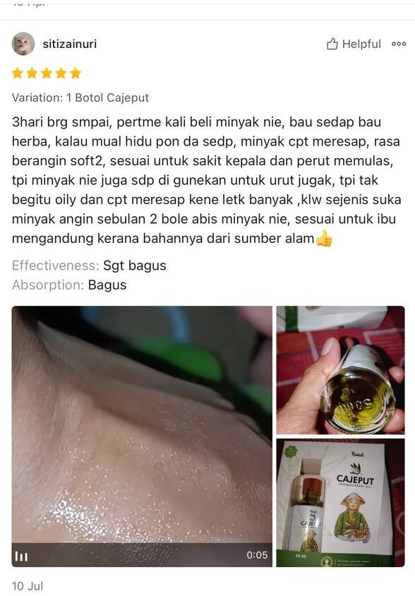 “..Bila mengandung ni bahaya kalau guna minyak angin sebarangan, tapi pinggang badan semua rasa sakit-sakit. Alhamdulillah ada Raed Cajeput Aromatherapy Oil selamat digunakan dan kesan yang pantas untuk baik..”